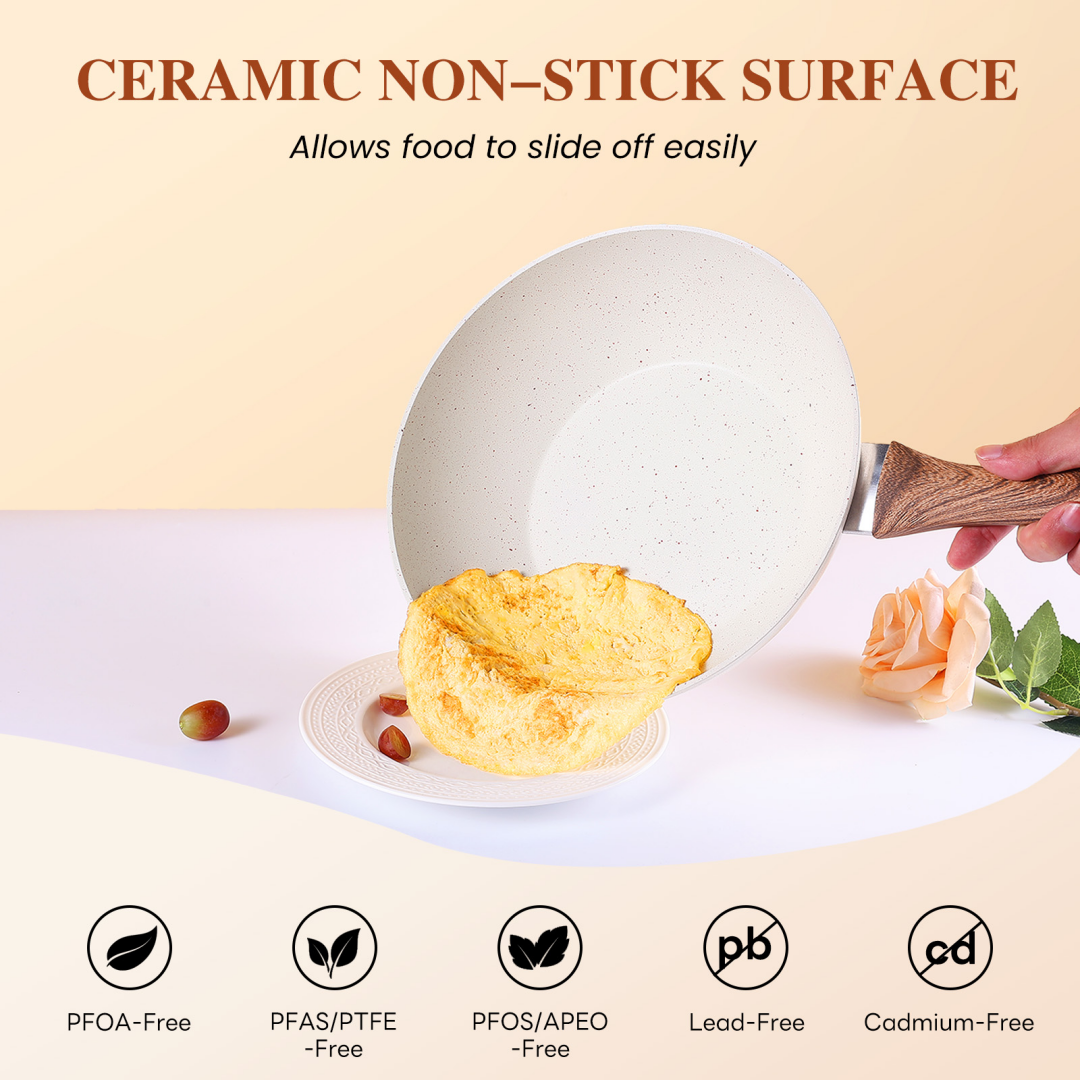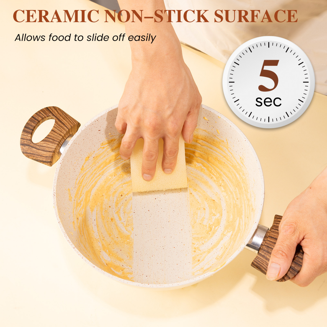 - Easy to Clean and Healthier Nonstick Cooking:The inner surface is coated with a non-stick layer, our pots and pans deliver safer, toxin-free cooking with less oil or butter required. Enjoy healthier meals with food that slides right off. Simply wipe with a paper towel or rinse under water—no scrubbing needed. Hand-wash recommended to preserve the nonstick finish and keep your cookware looking new. Please note: Do not place in the dishwasher for long-term use.