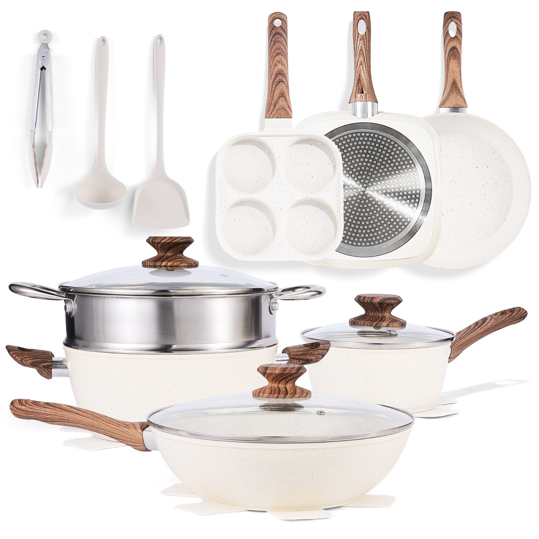 - Complete 17-Piece Cookware Set:Includes: frying pot with glass lid, 9.5" souppot with glass lid, 6.3" milkpot with glass lid, 11" frying pan, 11" square pan, 7.5" egg pan, 9.5" steamer, 4 pan protectors(8.7"/9.5"/10.3"/11" ), 1 silicon ladle, 1 cooking tongs, 1 silicon spatula.